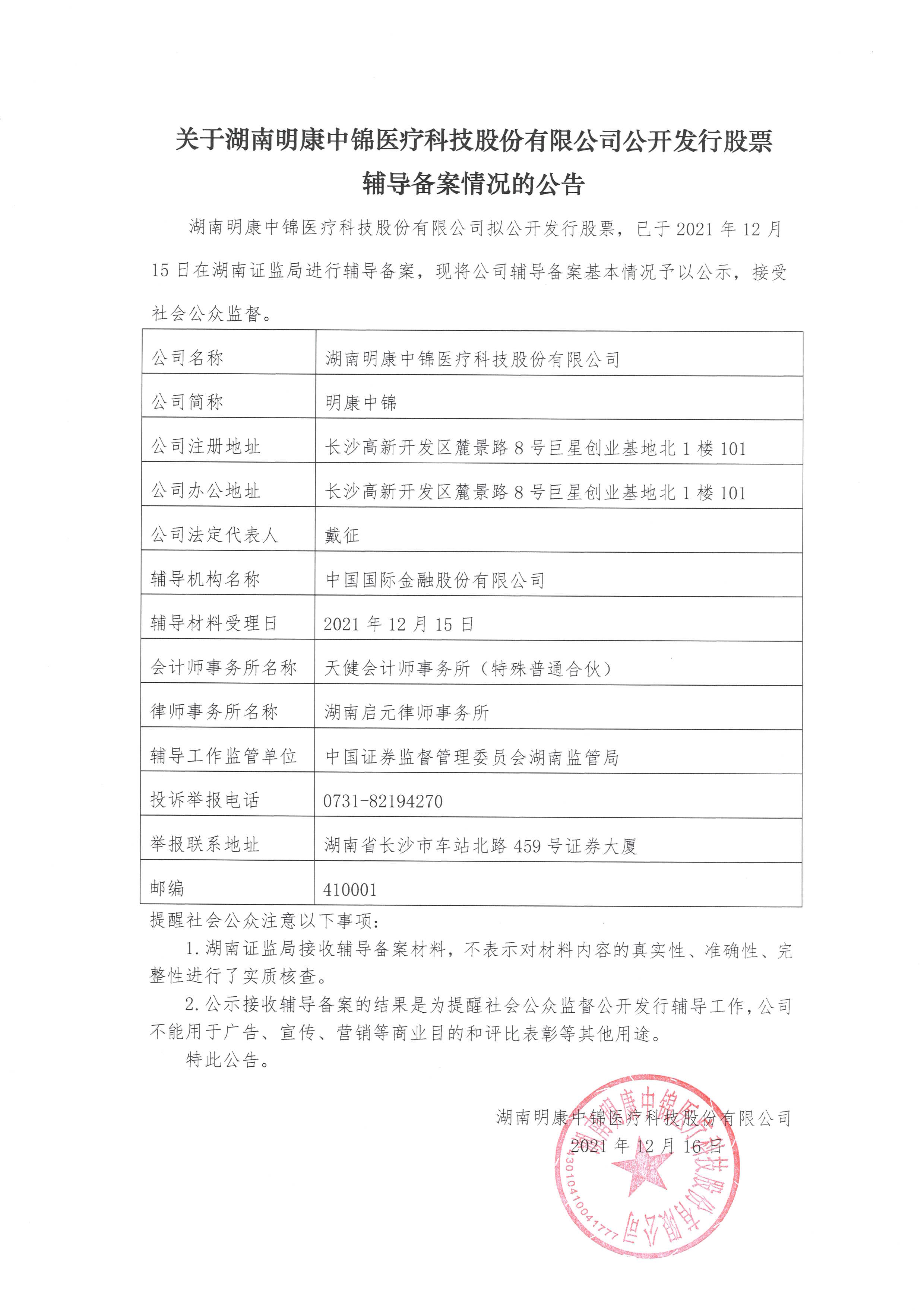 关于湖南明康中锦医疗科技股份有限公司公开发行股票辅导备案情况的公告