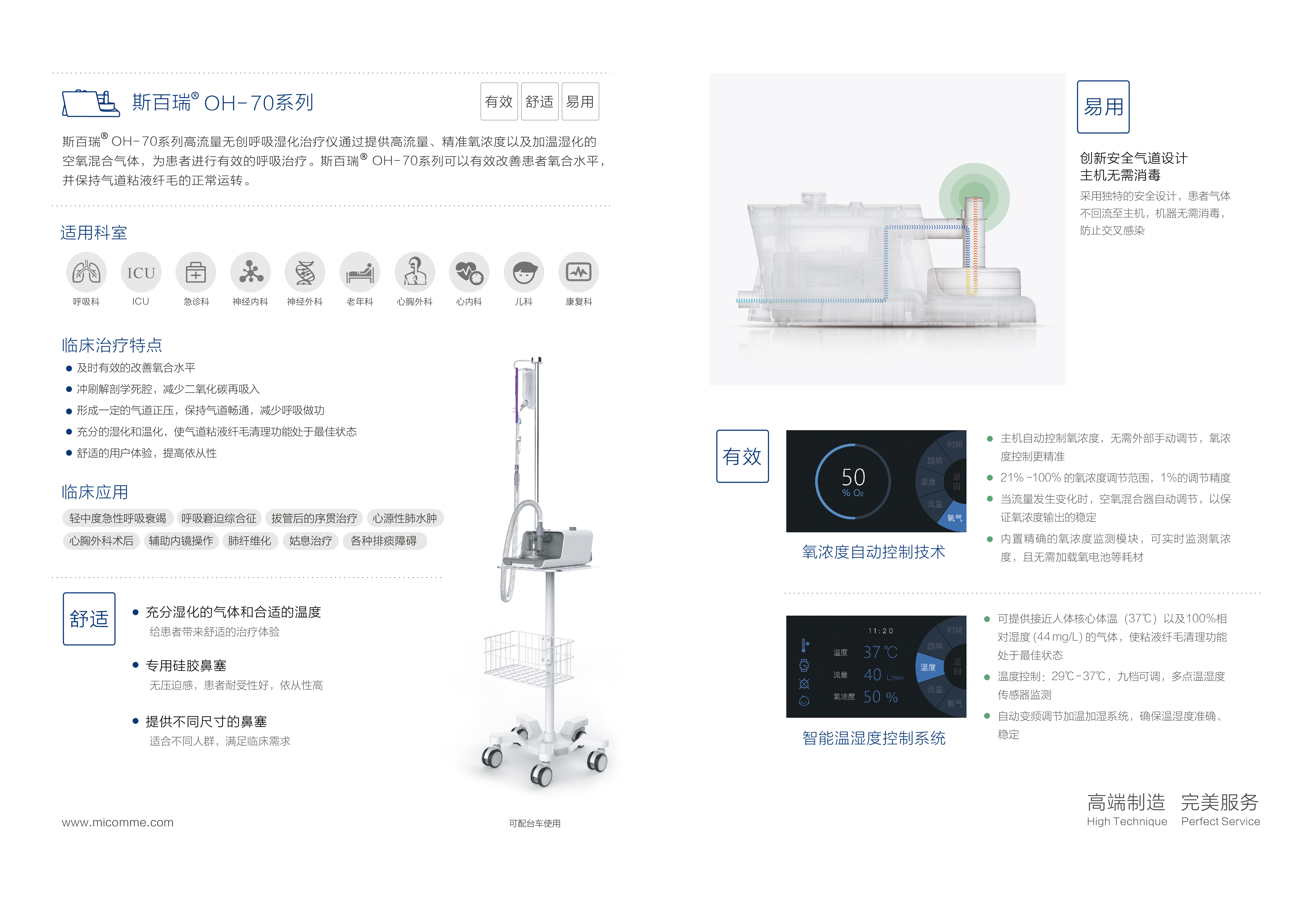高流量无创呼吸湿化治疗仪用于有自主呼吸的患者,通过提供一定的流量、加温湿化的呼吸气体进行有效的治疗。这些患者包括湿化治疗、氧气治疗、气管插管和气管切开的患者。不能用于生命支持设备。