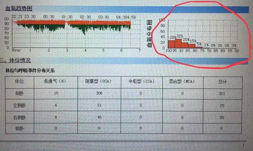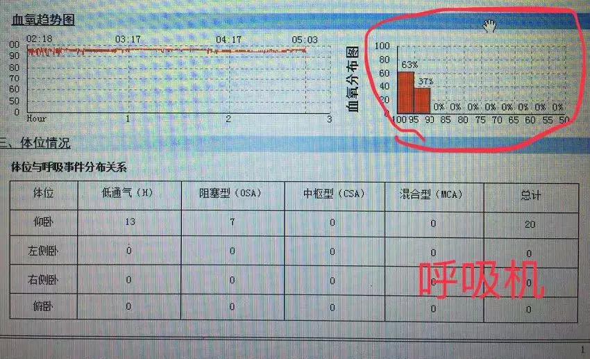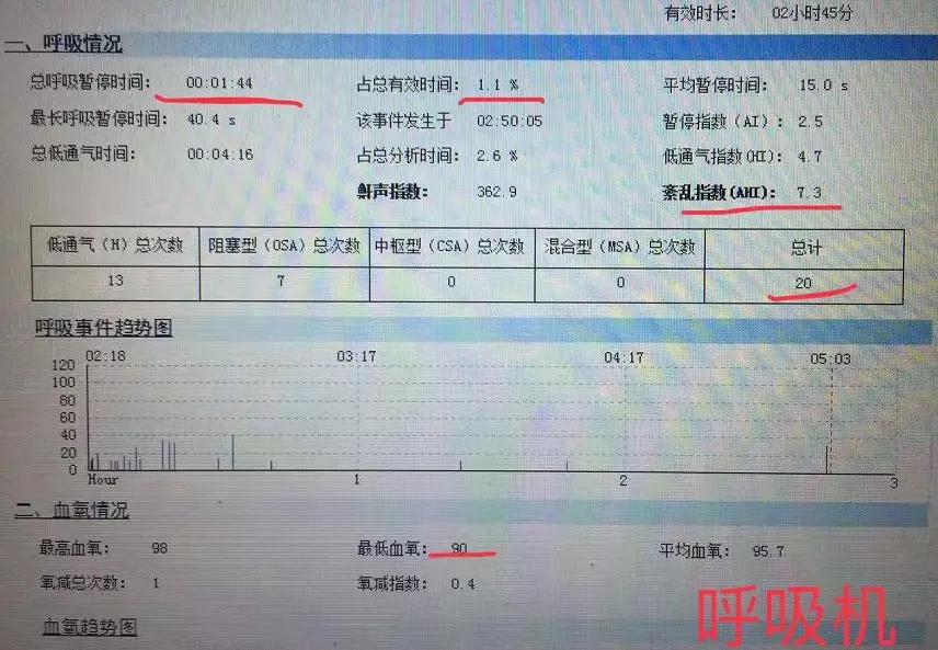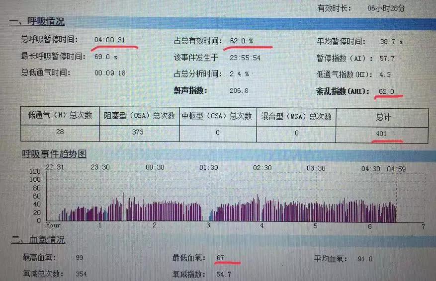 经过医院的睡眠监测确定是阻塞性睡眠呼吸暂停低通气综合征。当时睡眠监测报告AHI达到62,属于重度呼吸暂停,血氧67%,血压160/100,有轻度的嗜睡症状,脸色比较苍白,无精打采。医生建议使用无创呼吸机通气治疗。