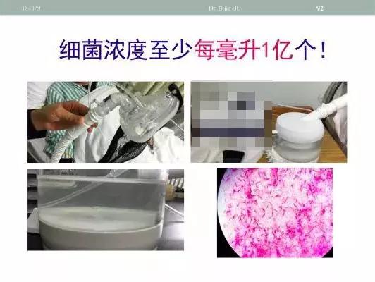 上海中山医院感染病科胡必杰教授分享于SIFIC论坛的文章《家用呼吸机不消毒,吸入的雾化气体可能引发致命性肺炎!》中提到从微生物层面进行分析和调查得出在2个月未进行消毒雾化罐的水细菌污染量,至少每毫升1亿条细菌!!